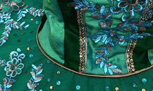Lots of options will be discussed at the design stage, the possibilities are endless, chose different top lines, inset panels, sleeves, cuffs etc. As with the top plate the bodice is often highly decorative with lots of things to make the costume sparkle and catch the eye.