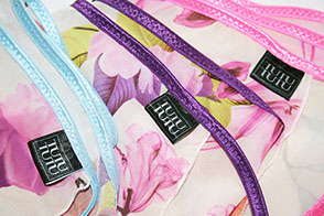 We work with a limited edition of semi sheer fabrics, teamed with different elastic colours so that you can customise your look to suit your range of leotards, just select the colour you want in our shop and we'll make it and post it out to you.