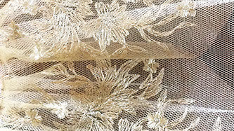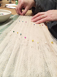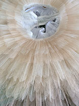 10 layers of netting graduated from tiny leg frills to the largest top layer (in all usually around 10m of netting!). These layers are hand pleated and sewn on to a knicker which we prepare from 2 layers (for greater opacity) of  bobbinet mesh fabric.